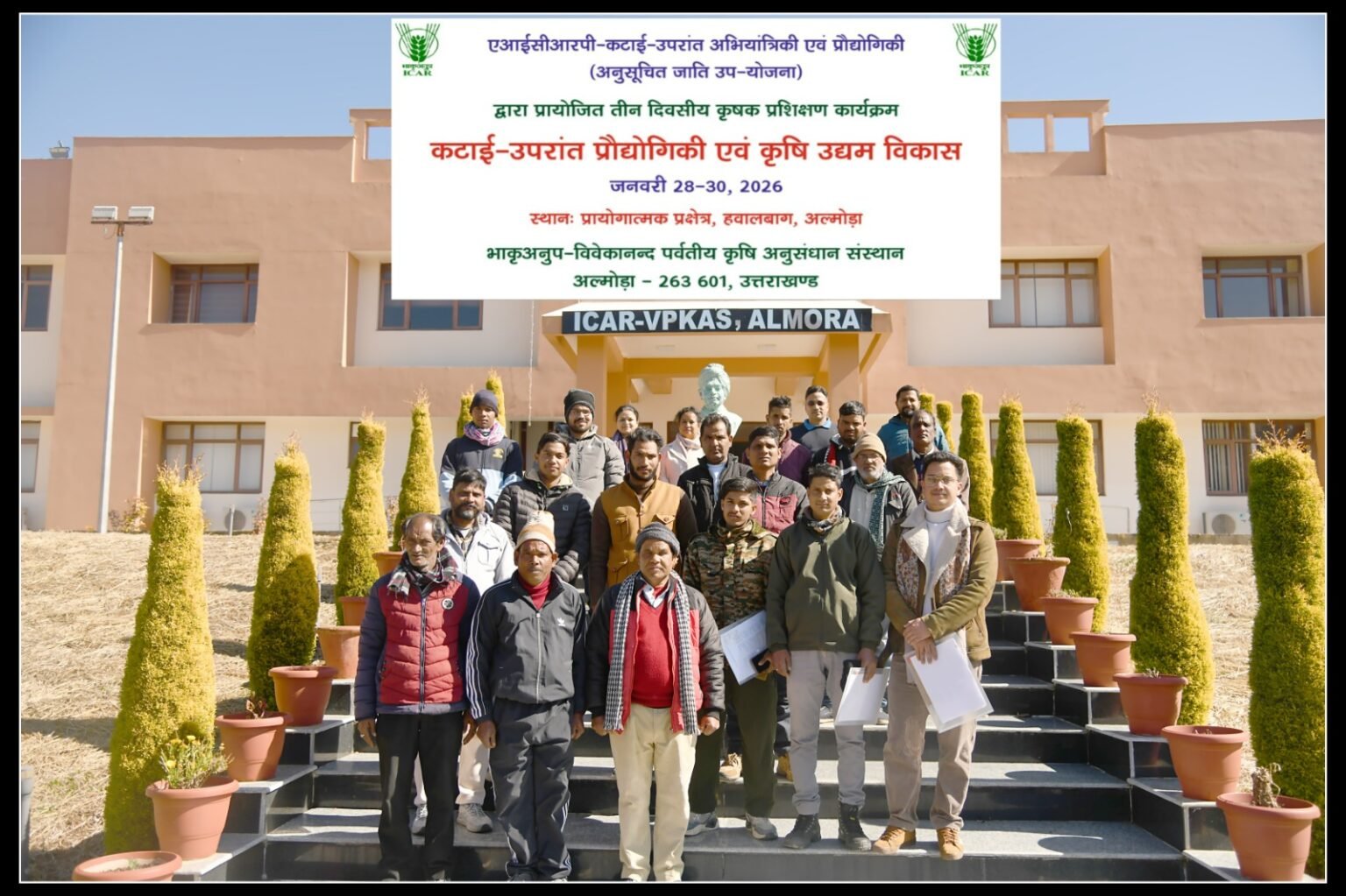 भारतीय कृषि अनुसंधान परिषद के विवेकानंद पर्वतीय कृषि अनुसंधान संस्थान, अल्मोड़ा में अखिल भारतीय समन्वित अनुसंधान परियोजना-कटाई उपरांत अभियांत्रिकी एवं प्रौद्योगिकी की अनुसूचित जाति उपयोजना के अंतर्गत “कटाई-उपरांत प्रौद्योगिकी एवं कृषि उद्यम विकास” विषय पर दिनांक 28 से 30 जनवरी 2026 तक तीन दिवसीय व्यावहारिक प्रशिक्षण कार्यक्रम का सफल आयोजन किया गया। कार्यक्रम में अल्मोड़ा एवं बागेश्वर के अनुसूचित जाति के 17 कृषकों ने सक्रिय सहभागिता की। प्रशिक्षण कार्यक्रम का उद्घाटन संस्थान डा मनोज कुमार, प्रधान अन्वेषक एवं डा0 कुशाग्रा जोशी, सह-अन्वेषक द्वारा किया गया। पर्वतीय क्षेत्रों में कृषि को लाभकारी बनाने के लिए कटाई-उपरांत प्रबंधन प्रसंस्करण एवं मूल्य संवर्धन की महत्ता देखते हुए संस्थान के निदेशक डा0 लक्ष्मी कांत के निर्देशन में इस प्रशिक्षण का आयोजन किया गया।