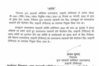 निबन्धक दुग्ध सहकारी समितियां उत्तराखण्ड, हल्द्वानी (नैनीताल) के आदेश संख्या सी-3081/विधि/सह०/ प्रशा० नियुक्ति-पत्रा0/2021-22 दिनांक 05 जनवरी, 2022 के द्वारा श्री…