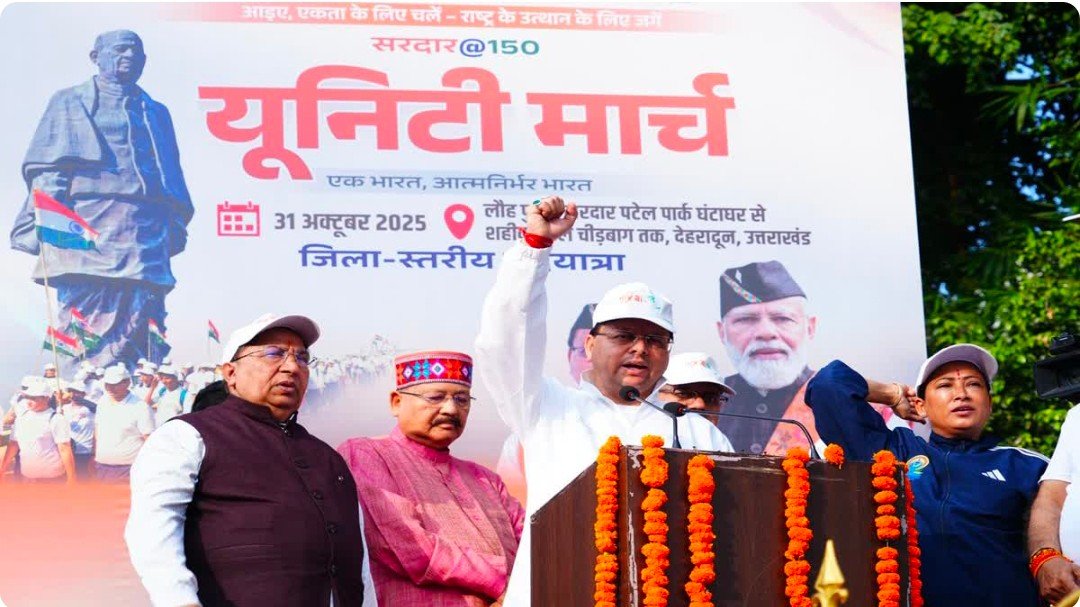 लौह पुरूष सरदार बल्लभ भाई पटेल की जयन्ती के मौके पर यूनिटी मार्च वॉकथॉन का देहरादून में आयोजन किया गया, मुख्यमंत्री पुष्कर सिंह धामी ने शुक्रवार को घंटाघर में उनकी मूर्ति पर श्रद्धा सुमन अर्पित कर श्रद्धांजलि दी, साथ ही एकता पदयात्रा का शुभारंभ कर उसमें प्रतिभाग भी किया, इस दौरान सीएम धामी ने युवाओं को स्वदेशी अपनाने और नशा मुक्त उत्तराखंड की शपथ भी दिलाई, इस दौरान बड़ी संख्या में लोग शामिल हुए।