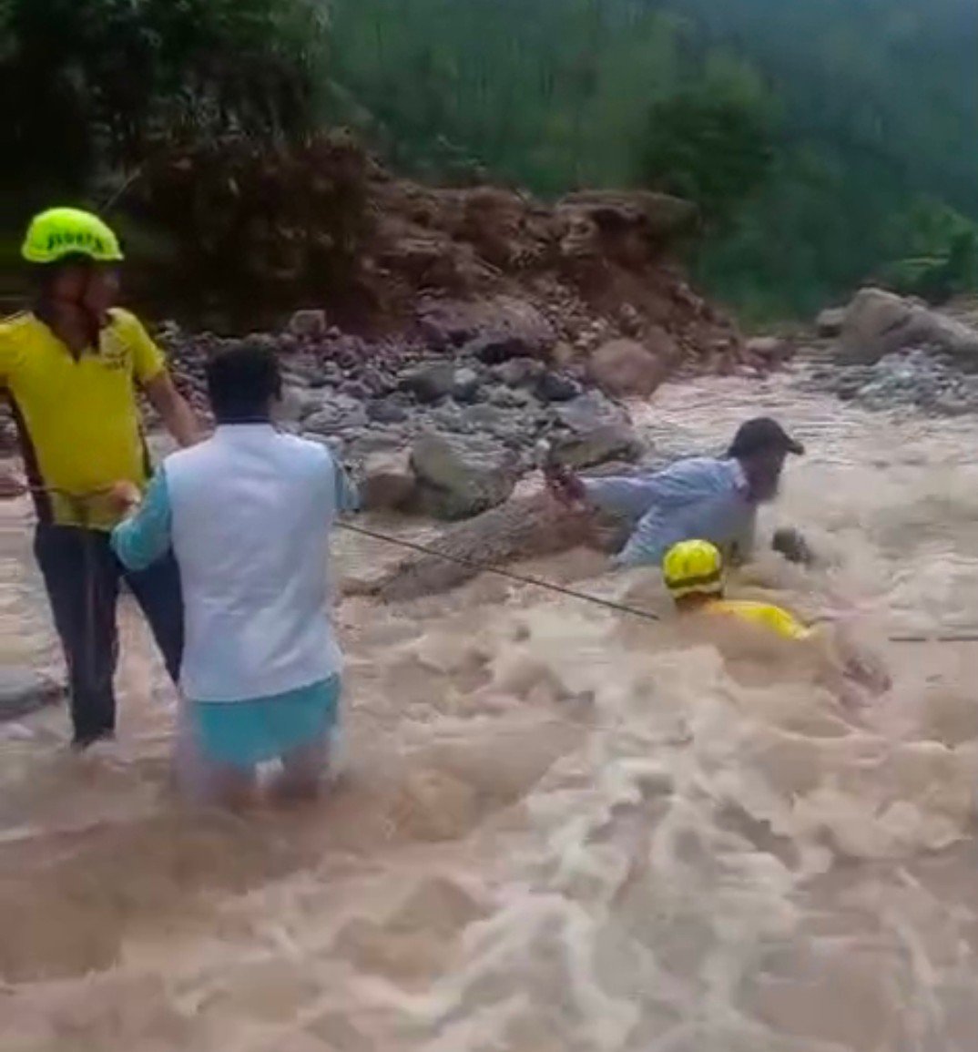 बागेश्वर जिले के कपकोट क्षेत्र में बारिश की वजह से 2 लोगों की मौत हो चुकी है जबकि, 3 लोग लापता चल रहे हैं, ऐसे में आज स्थानीय विधायक सुरेश गढ़िया अपने क्षेत्र में बारिश से हुए नुकसान का जायजा लेने के लिए निकले थे, लेकिन रास्ते में उन्हें गदेरा पार करना पड़ गया, जहां विधायक को तो एसडीआरएफ के जवानों ने रस्सियों के सहारे गदेरा पार करवा दिया, लेकिन उनका गनर भारी बहाव में अचानक गदेरे में बह गया, जिससे वहां अफरा-तफरी का माहौल बन गया. हालांकि, एसडीआरएफ के जवानों ने कुछ दूरी पर जाकर गनर को बमुश्किल बचाया।